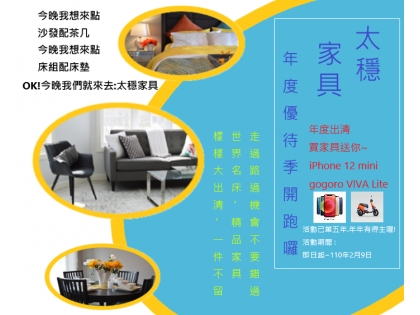太穩家具年度優待季開跑囉! 走過路過機會不要錯過 世界名床.精品家具.樣樣大出清.一件不留 年度出清買家具送你~ iPhone 12 mini 手機 gogoro VIVA Lite 電動機車 活動已第五年.年年有得主喔! 活動期間 即日起~110年2月9號 |