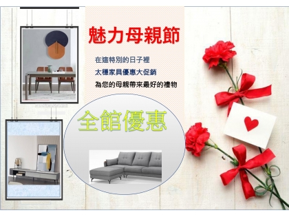 | 全館優惠大促銷 感恩母親節...家具大促銷 來太穩...挑選心愛的家具 為您的母親送上最特別禮物 #地點:岡山區岡山路170號 #岡山舊省道勵志國宅對面 |